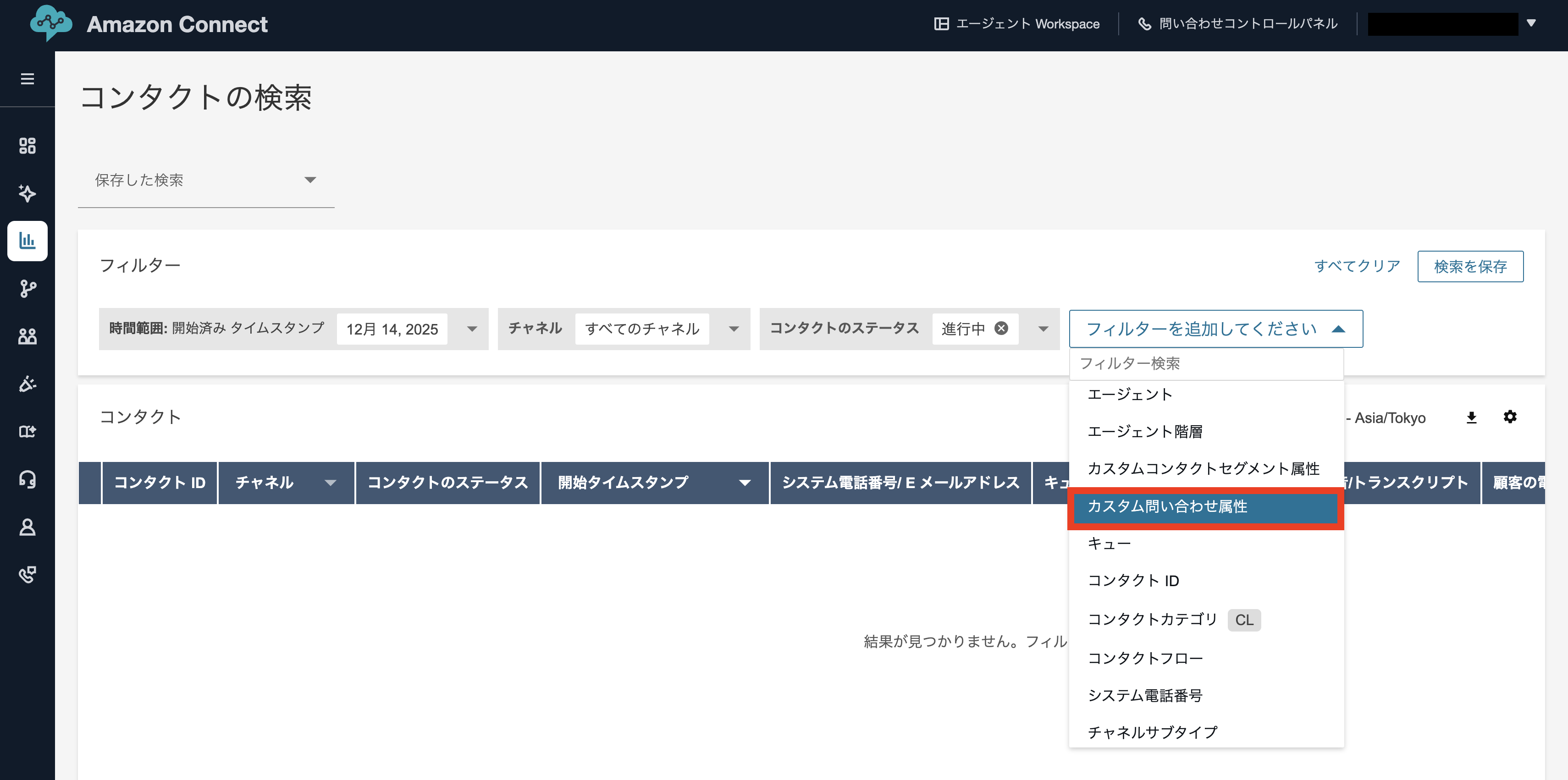 参考:カスタムコンタクト属性またはコンタクトセグメント属性を使用して Amazon Connect でコンタクトを検索する