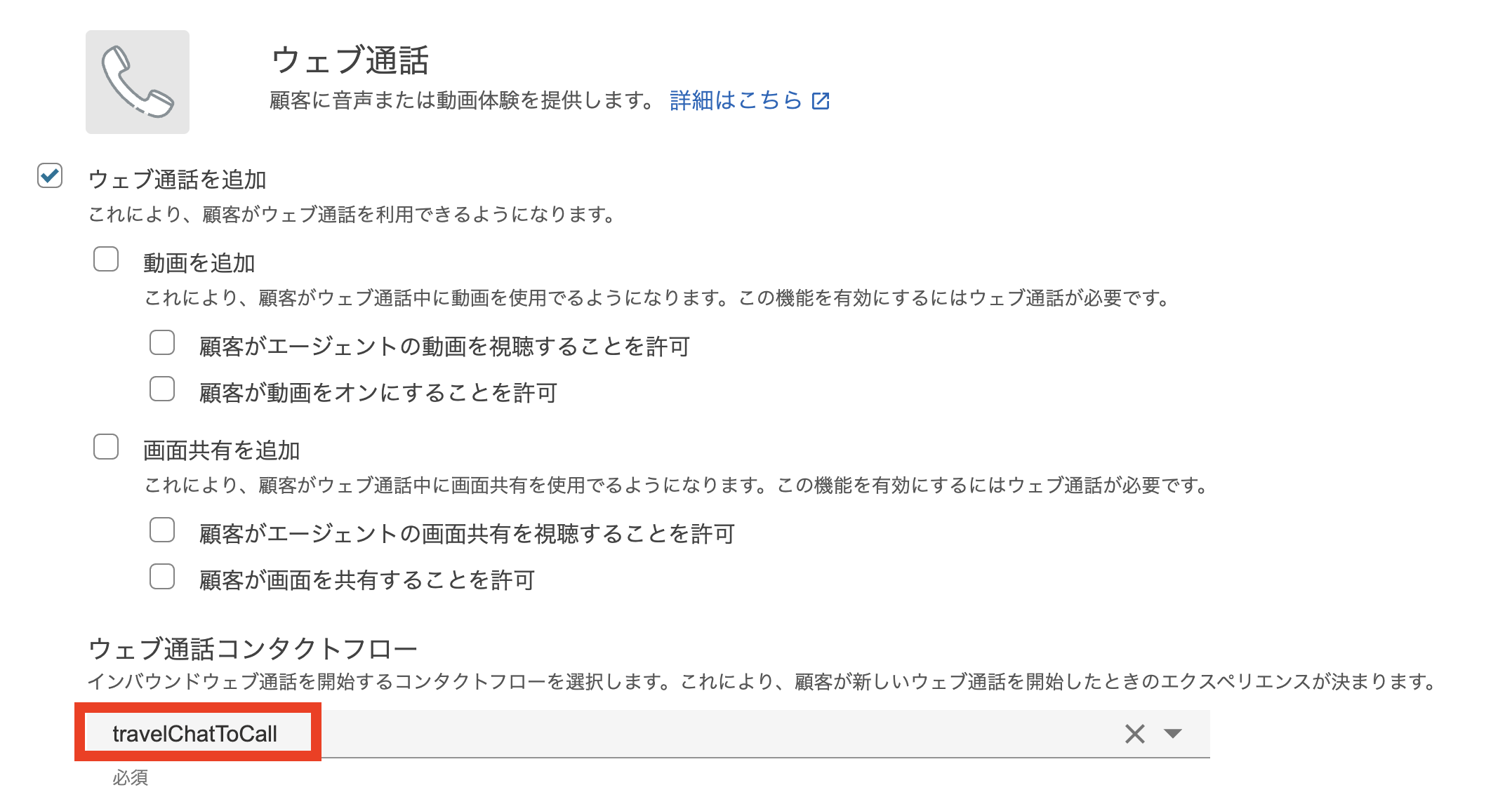 通話に切り替わった際のフローを編集します。チャットウィジェット追加時に「ウェブ通話コンタクトフロー」で設定したフローです。