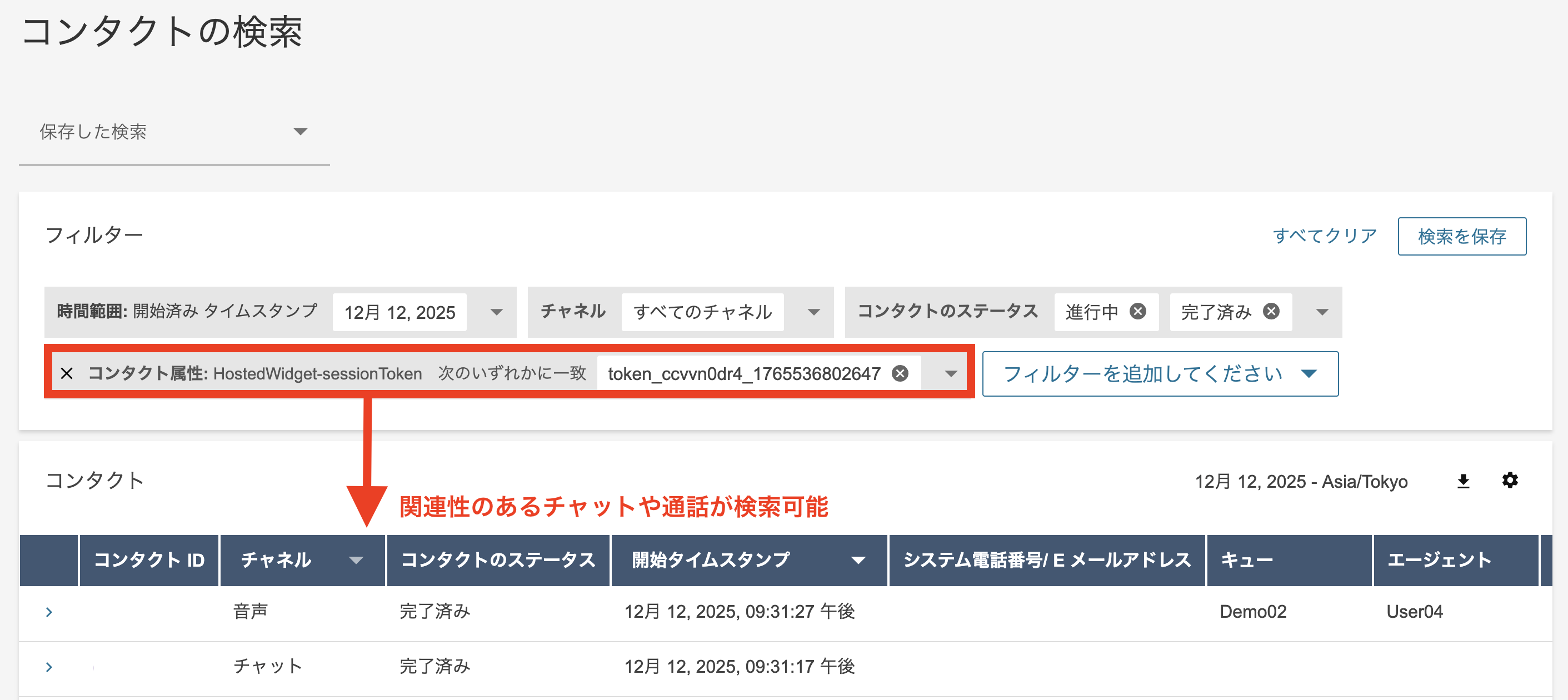 トークンでコンタクトの検索を行えば、関連性のあるチャットや通話が検索可能です。