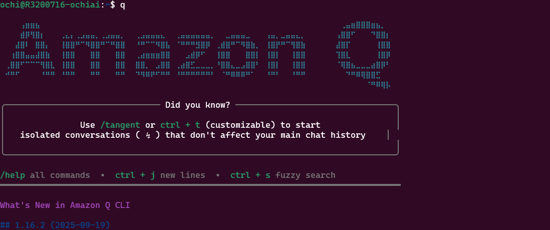 無事にAmazon Q DeveloperのCLIを起動できました。