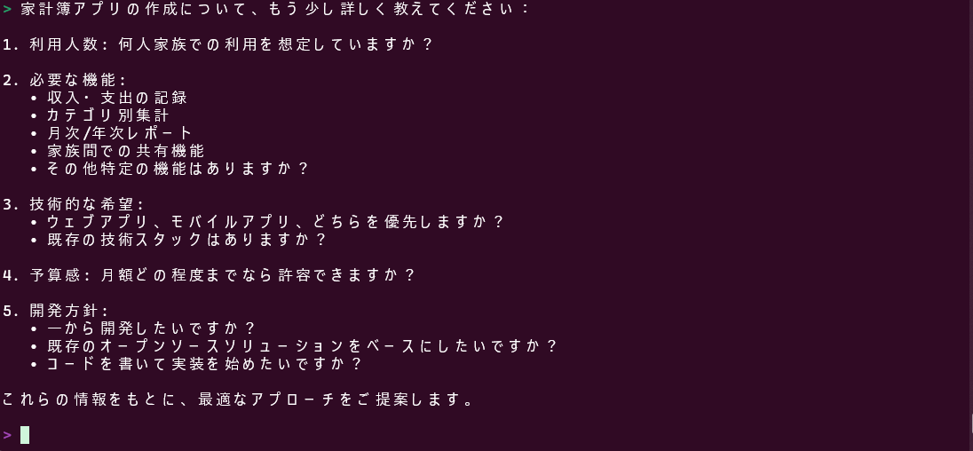 試しに「家計簿アプリを作りたいです!」と入力してみたところ、画像のような質問項目が出力されました。