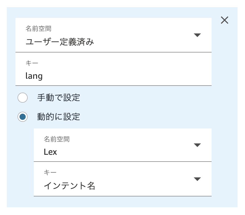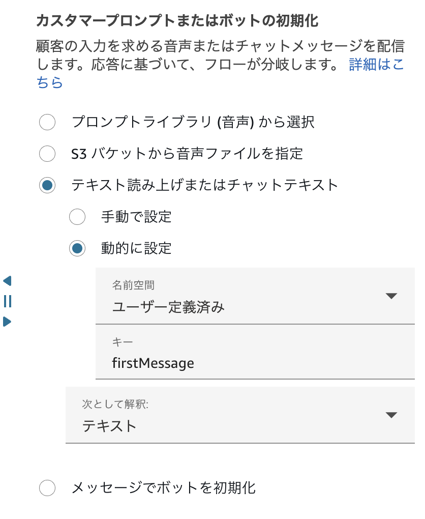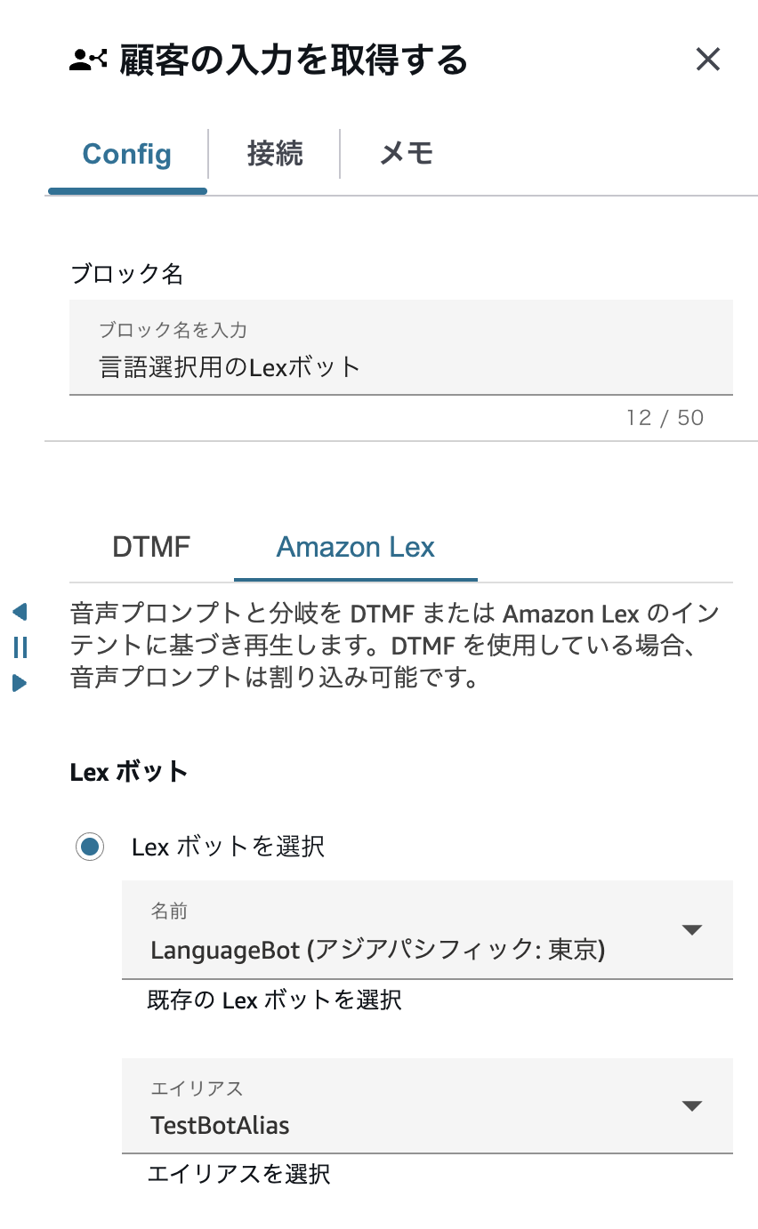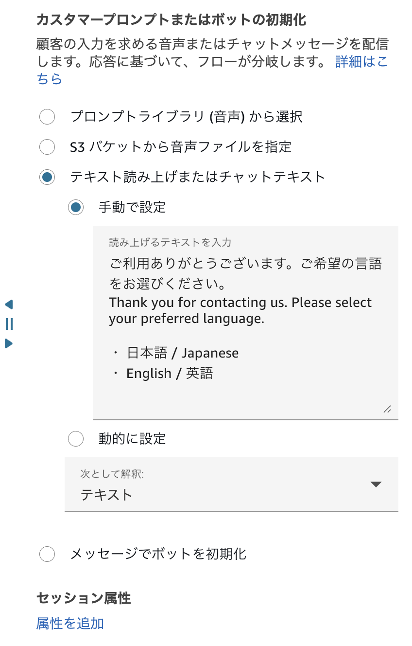 ここでは言語選択用のLexボットをセットし、プロンプトを設定しています。