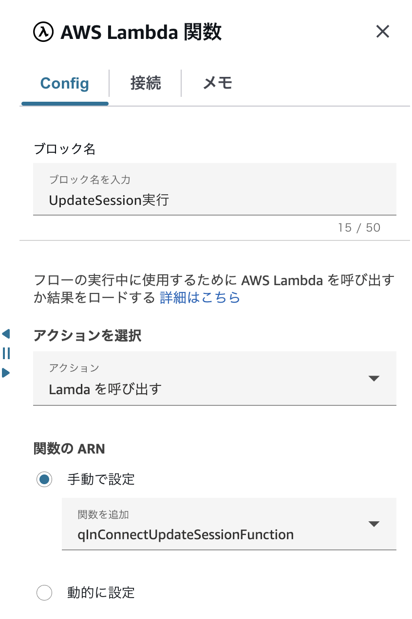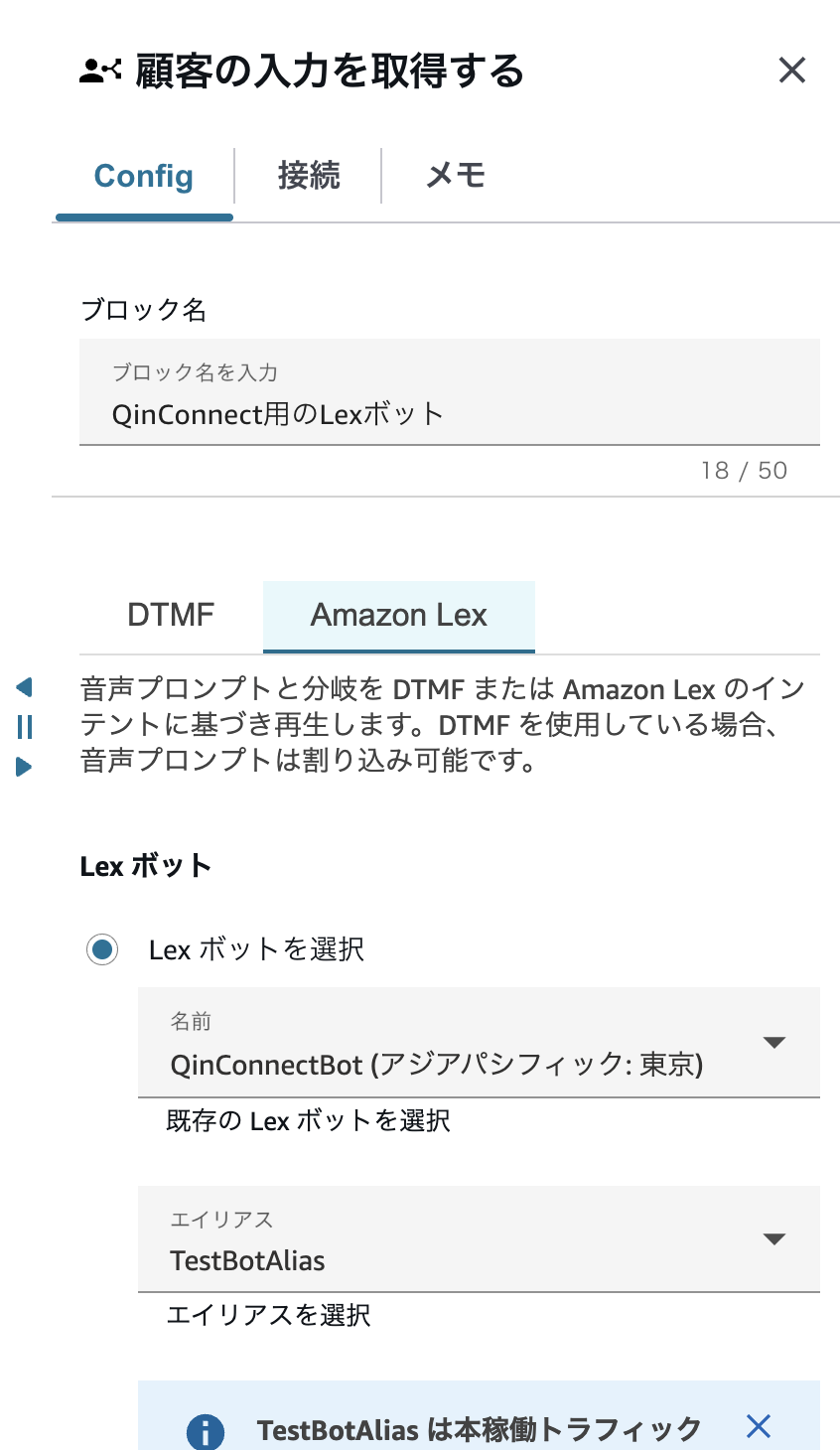 Qのセッション作成ブロックの後に、AIエージェント用のLex(顧客の入力取得)ブロックを配置するようにしましょう。