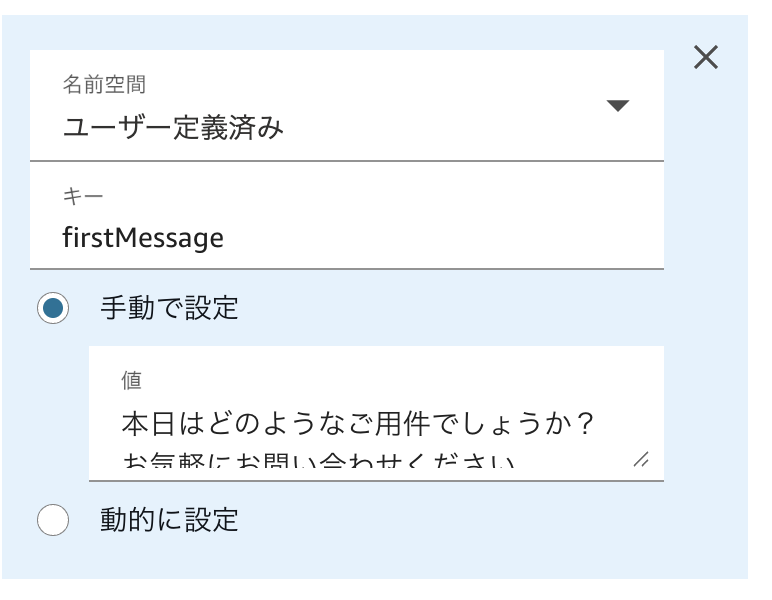 AIエージェント用のLexをセットし、保存していた挨拶文を動的に設定します。