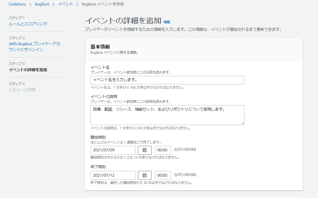 メニューからCodeGuru > BugBust > Eventsを選び Create BugBust eventします