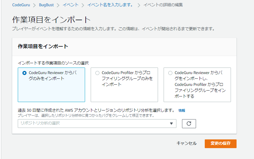 | インポートする作業項目のソースの選択 | CodeGuru Reviewerからバグのみをインポート |