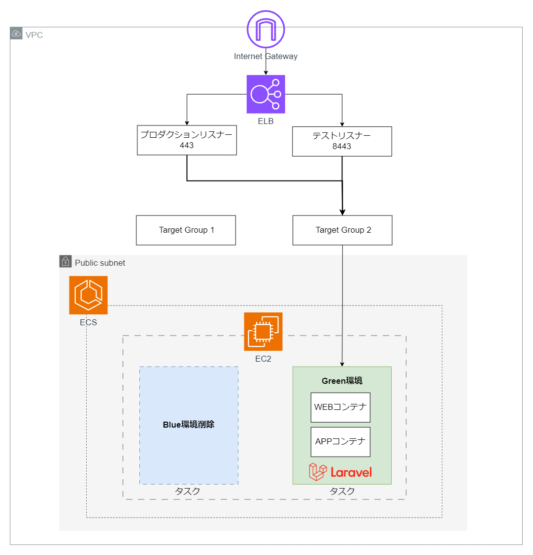 上記より、ブルーグリーンデプロイが正常に行われ、リスナーとターゲットグループの設定が期待通り以下の画像の構成に変更されたことがわかります。