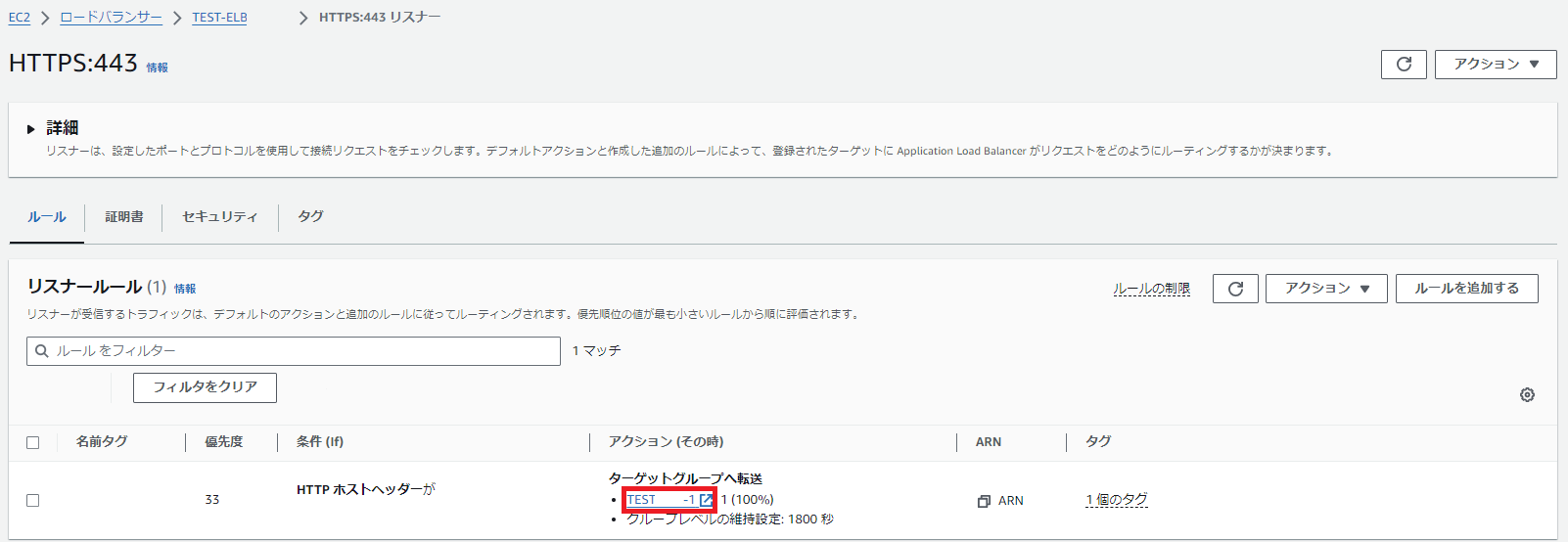 ブルーグリーンデプロイ前のALBのリスナールールをみてみると、443リスナーと8443リスナーが同じターゲットグループ(TEST-1)に向いていることが確認できます。