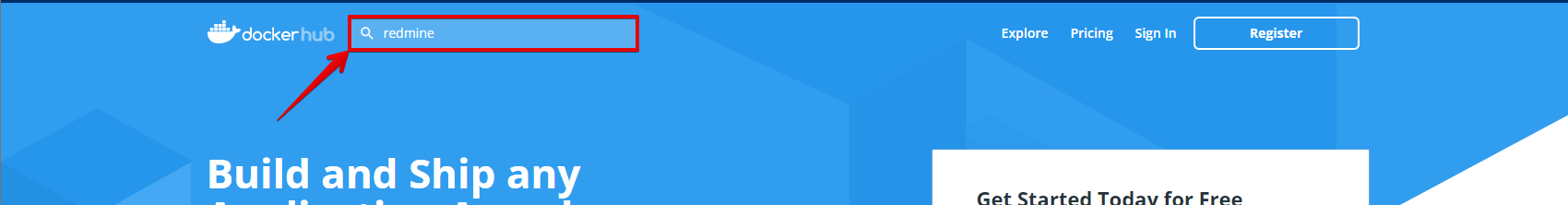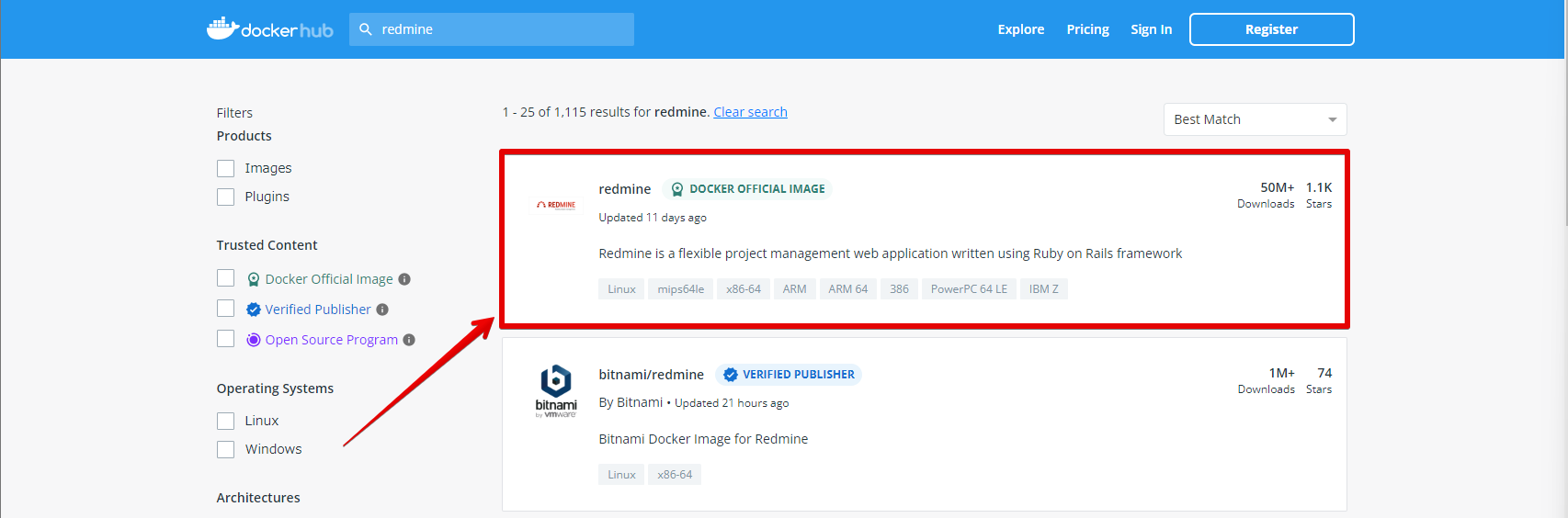 Docker Hub にアクセスし、検索ボックスに “redmine” と入力して検索します。