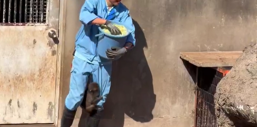 お兄さんがエサやりのためにサル園に姿を現すと、パンチくんは誰よりも早く駆け寄って、その足にギュッとしがみつくんです。その姿は、本当のお母さんに甘える赤ちゃんそのものでした。