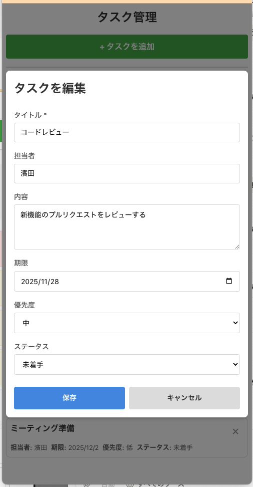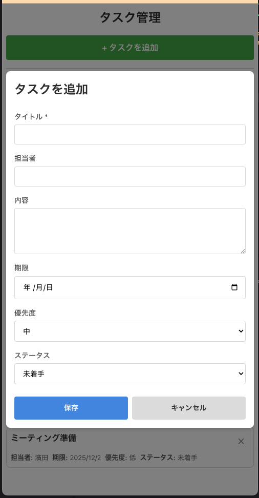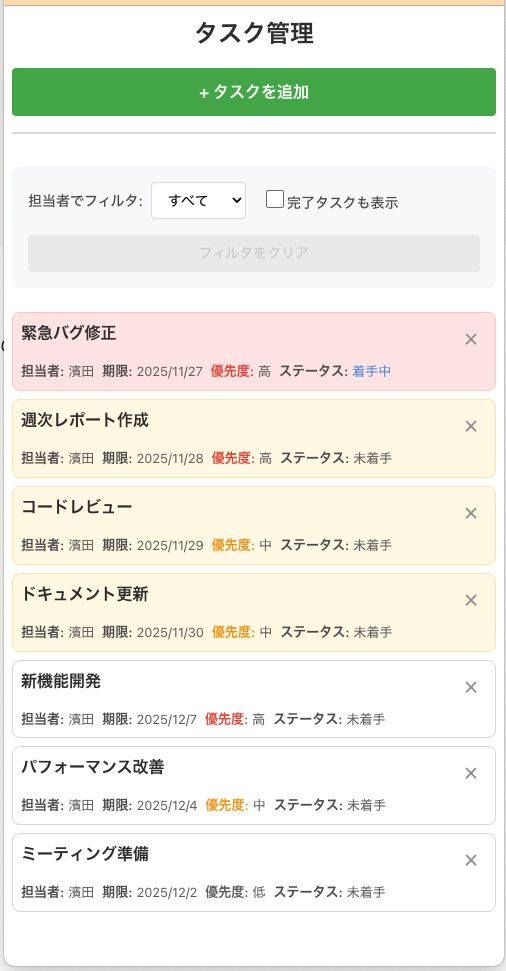 タスク管理ツールを作って webアプリ ログイン機能はなく、1ページ完結型 画面上部にタスク入力欄(タイトル、担当者、内容、期限)+ボタンからポップアップ入力でもいいよ 画面下部に一覧リスト(タイトル、担当者、期限) リスト選択すると編集ポップアップ画面表示 一覧には削除機能もほしい データは永続化 担当者でフィルタできる機能 今日やるべきことを優先度順に表示したい 品質保証として、Playwright MCPを活用し、E2Eテストが通っていることも要件 ステータス(未着手、着手中、完了)もつけて、完了したものはデフォルトでは表示しない。完了分も表示するチェックボックス的なものをつける 期限3日前〜当日までのタスクは上位に表示する 期限当日のものを背景薄い赤で表示 期限3日前を切ったものは背景薄い黄色で表示 |