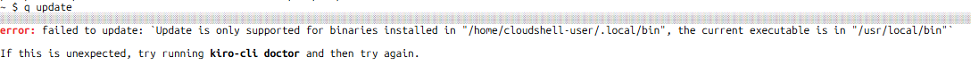 AWS CloudShellではAmazon Q Developer CLIの場合のq updateは利用できないようになっていました。アップデートする場合は、別の手順を使う必要がありそうです。
