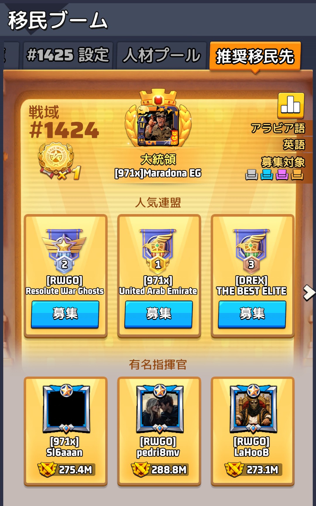 中でも中東圏のプレイヤーはとても強い印象があります。理由はシンプルで、課金額が桁違いだから。いわゆる「オイルマネー」とでも言うのでしょうか。資金力のある中東プレイヤーは序盤からその差を見せてくれます。