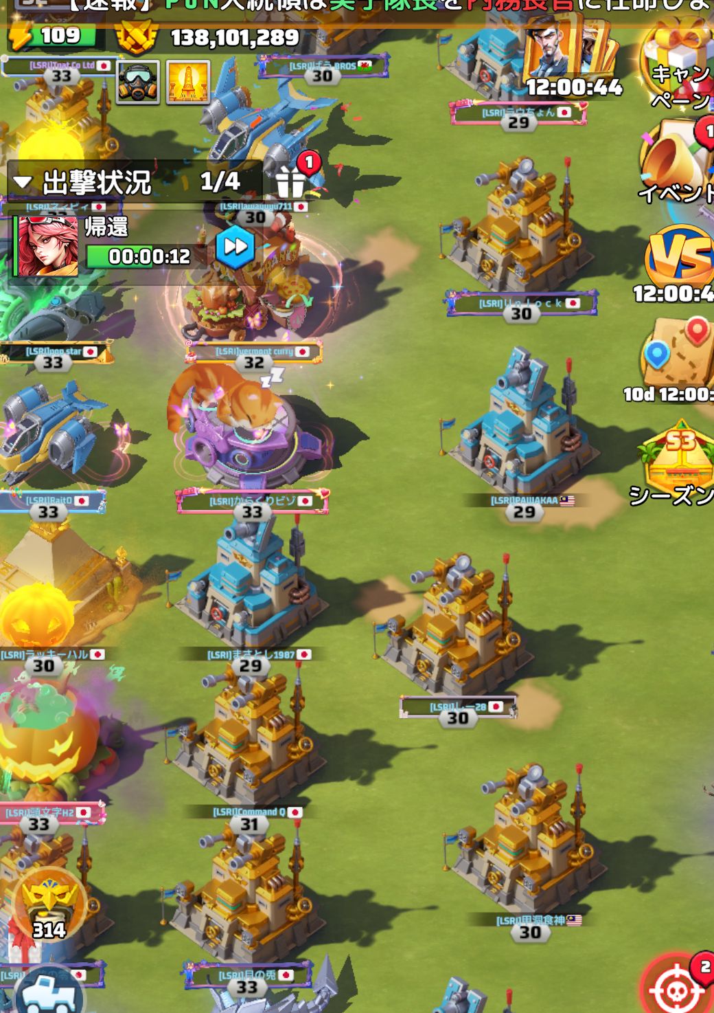 スキルやレベルの差も当然あります。課金額や経験値によって各プレイヤーの戦力は大きく違うので、強いメンバーが前線で戦い、後方支援が得意なメンバーが資源を送り込む——そうした役割分担をどう設計するかが、勝敗を左右します。