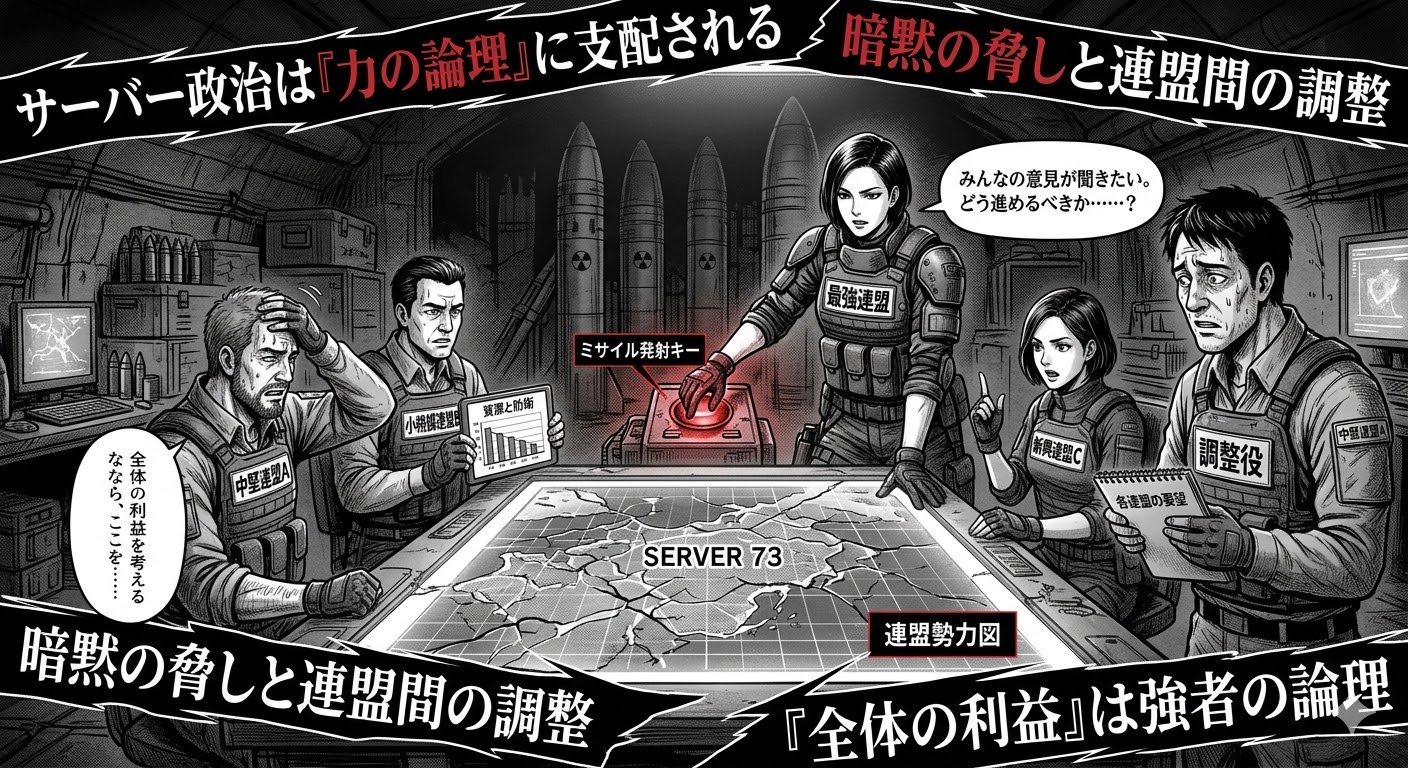 また、各連盟の調整役を担うメンバーも大変で、自分の連盟の利益を守りながら他の連盟との関係も維持しなければならない。他の調整役から「サーバー全体のことを考えろ」と言われることもあるそうですが、その「サーバー全体の利益」というのも、結局は強い連盟の論理の延長線上にある「全体」だったりします。