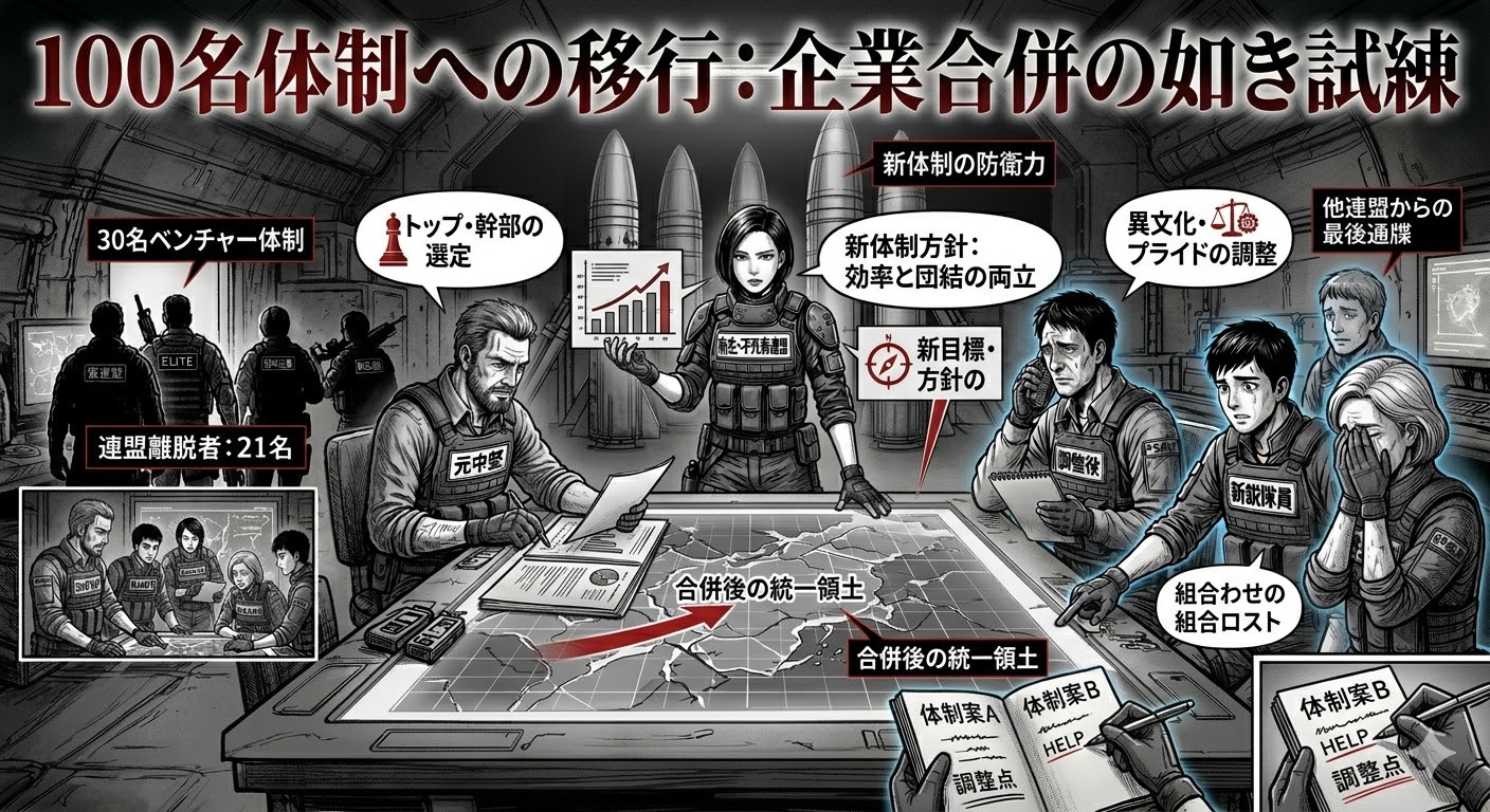 ただ、サーバー内の勢力争いが激しくなるにつれ、単独では厳しい場面が増えてきました。そこで持ち上がったのが、別のアライアンスとの合併です。