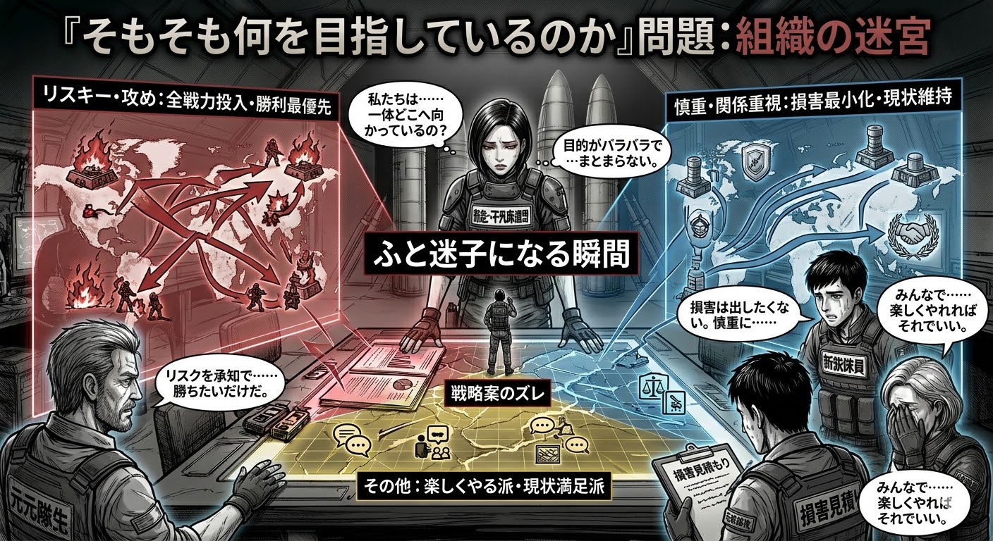 リスクを承知で積極的に攻めていきたいメンバーもいれば、他の連盟との関係を崩したくないから慎重にいきたいというメンバーもいます。兵士が減っても構わないから勝ちにいきたい人もいれば、できれば損害を出したくないという人もいる。高い目標を掲げてチャレンジしたい人もいれば、勝ち負けより楽しくやれればそれでいいという人もいます。