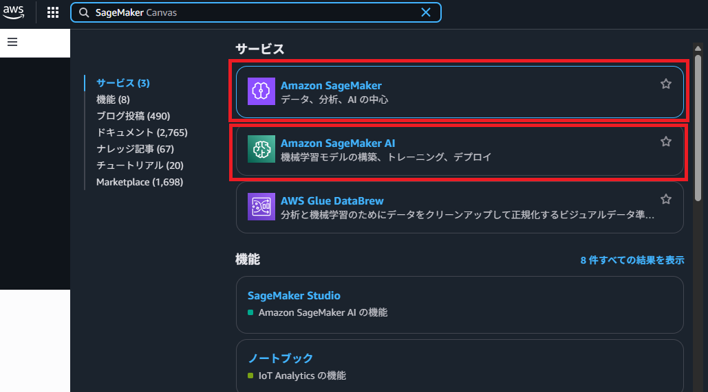 SageMakerに触ってみよう!と思い立ち、コンソールで検索をしてみたところ、「SageMaker」の名前が付くサービスが2つ出てきました。