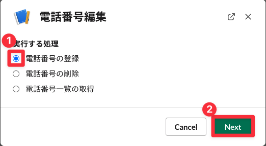 アプリのホーム画面に追加された”電話番号管理”をクリックすると、以下のようなモーダルが開かれるので、”電話番号の登録”を選択して”Next”をクリックします。
